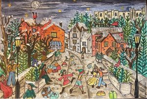 While the quaint and charming character of Durham, along with her passion for people in all their exuberance and wonderful strangeness seemingly motivates her paintings of exaggerated reality, her literary motivations are rooted in the soil of her pastoral home. Quite literally, Minty attributes much of her narrative focus on nature to her childhood among the famed North York Moors, joining a wealth of artists and authors who have been creatively inspired by this paradoxically imposing and sinister, yet subliminally romantic northern landscape. Indeed, Hockney’s colourful accentuation of Yorkshire’s most literarily emphasised location inspires Minty’s explosive and playful hues in her first children’s book: The Whimsy of Whispering Wood.