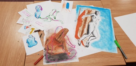 In art, nude women are often depicted as supine and vulnerable, regularly procured for “the male gaze” with their most sexual features taking centre stage. However the art from our life drawing sessions is more truthful, the bodies we draw are not solely supine or vulnerable. Bodies face away, sit and stretch.