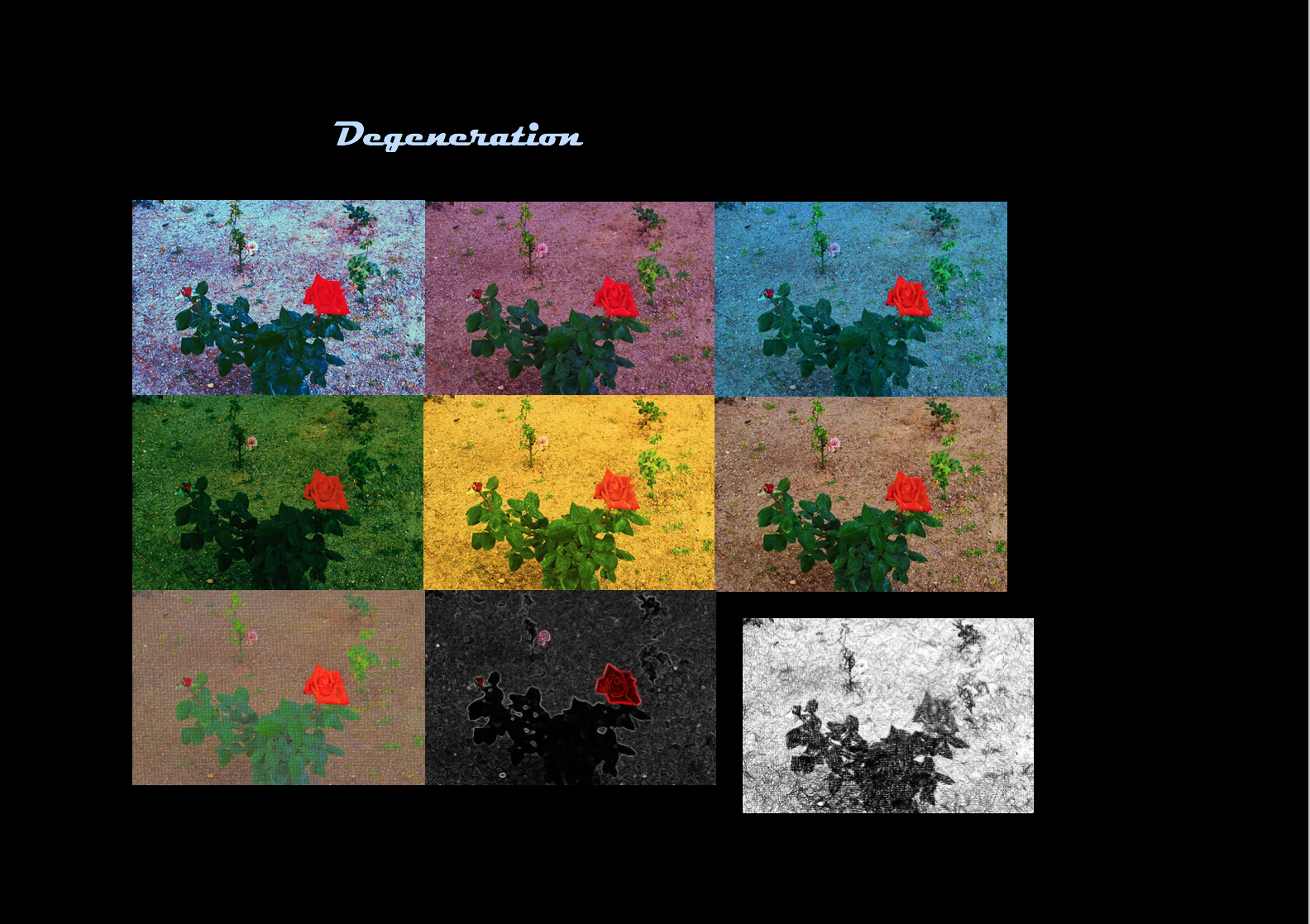 This series of edits was designed to reflect the process of environmental degeneration that climate change, as a result of human impact, has had on the Earth. The first five colours portray the planet in its original, full beauty, a time prior to the existence of humans. The sixth image depicts our current experience of the world. However, the seventh and eighth show the distorted nature of what we are rapidly hurtling towards if things are not changed soon. And if they are not changed then complete environmental degeneration, as an excess of emissions and waste cause our climate to change permanently, could result in the eventual dissipation of the environment altogether. This is set out in the final image which falls away from the rest of the group, reflecting the irrevocable damage that humans could have on the environment if we continue to remain passive on the issue of climate change.
