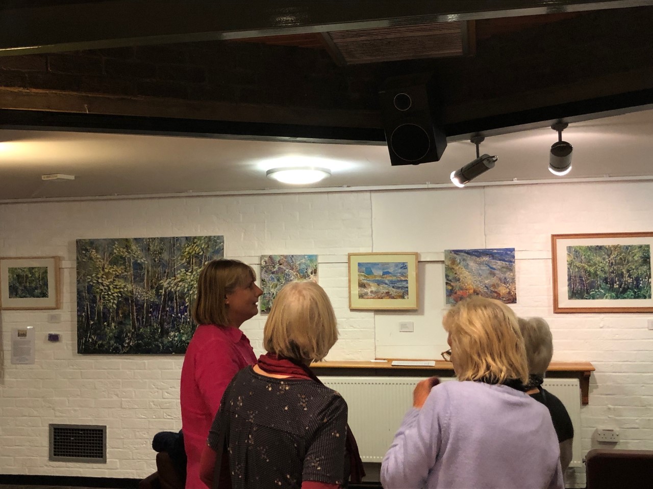 Suzanne (S): My work here is mainly collage and mixed media. The bulk of the work here on show today is a series on Bluebell woods. I live near Barnard Castle, and my house backs onto Flatts Woods, so I can pop over my fence and go into the woods. I took lots of photographs of the woods – especially during bluebell time and wild garlic season. I would then prepare a ground, a canvas or paper, and use bits of collage (different paints and inks) to build up layers. It creates a sculptural feel to the picture.