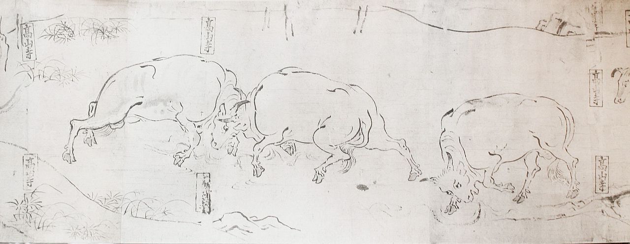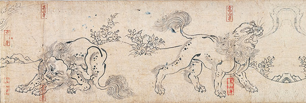 In the second scroll, common animals, for example, cows, chickens, dogs, eagles, hawks, and horses are painted. In addition, in the latter part, imaginary creatures or animals which were not existed in Japan at that time, for instance, water rhinoceroses (imaginary animal, Japanese who heard about rhinoceroses created them), qilin (a mythical creature appeared in Chinese literature, similar to Chimera), dragons, tapirs, lions, elephants, goats, leopards and tigers are painted. They are described realistically and naturally unlike the first scroll.