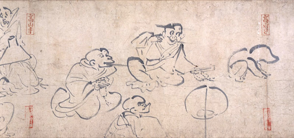 Apparently, the touch of forth scroll is different from others and impromptu. Not only playing but also the scene of the Buddhist service and annual events of the Imperial Court were painted. Three men in the middle of this painting were monks and they compete and compare their power results from their self- disciplinary training. It seems that they cast a spell on the men who turned into a frog on the right side. The lines coming out from their mouth might be a representation of the words or their power.