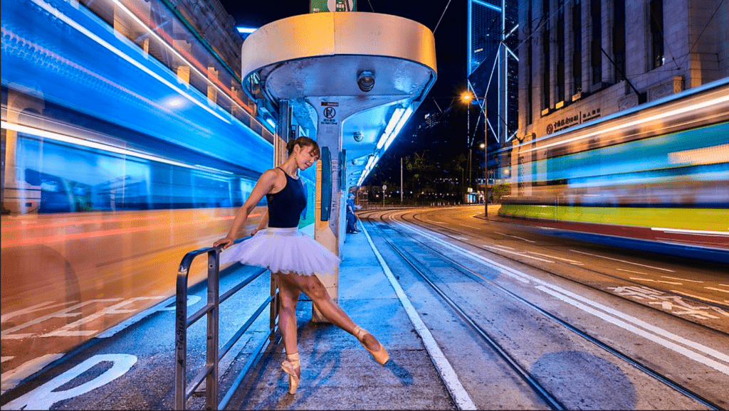 On the Hong Kong Ballet’s 40th-anniversary poster series, the American Design Army advertising agency was invited by the Hong Kong Ballet to create a tailor-made creative marketing campaign named “Never Stand Still”. In an extravagant display, a gorgeous show of music, dance, light and costumes entertained ballet fans around the world, as well as glittering in the international dance scene. The dancers of the Hong Kong Ballet put on eye-catching fluorescent green, pink and ice blue costumes and jumped out of the rehearsal room to dance in various attractions in Hong Kong, including historical landmarks, basketball courts, roads, ferries and tea houses. Webre took a series of photos displaying the unique characteristics of Hong Kong, breaking the common impression that “ballet is like wearing a veil and standing on tiptoes”, posing in an elegant posture. These bold images with the surrounding buildings and scenery have become an interesting sight, that incorporates Hong Kong characteristics with dance.