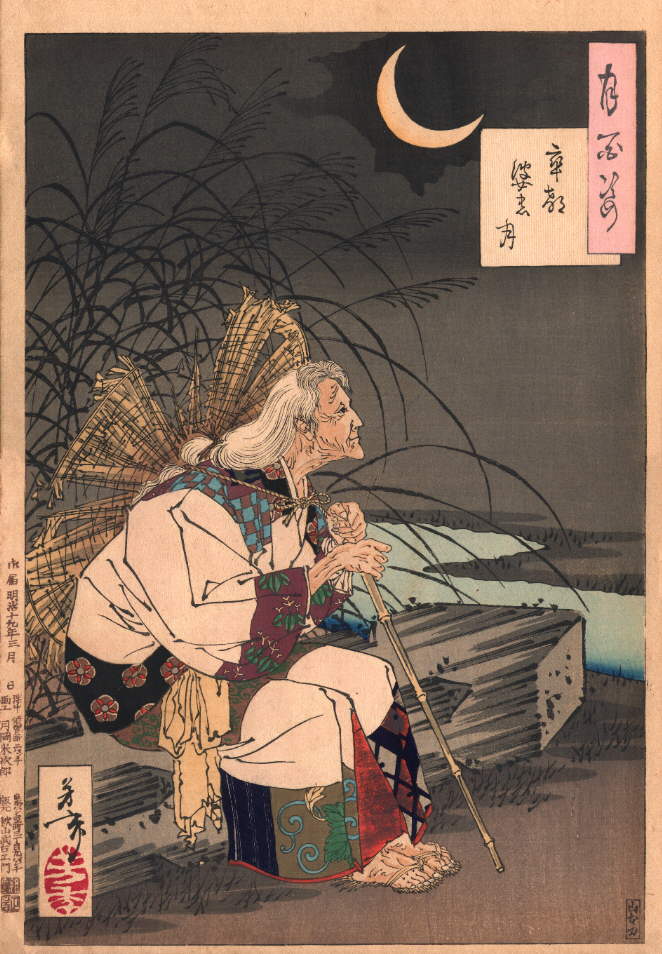 Yoshitoshi Tsukioka,100 Aspects of the Moon #25, Gravemarker Moon, the famous poetess Ono no Komachi meditates on the arrogance and heartlessness she displayed to her suitors as a young beauty. via Wikimedia Commons