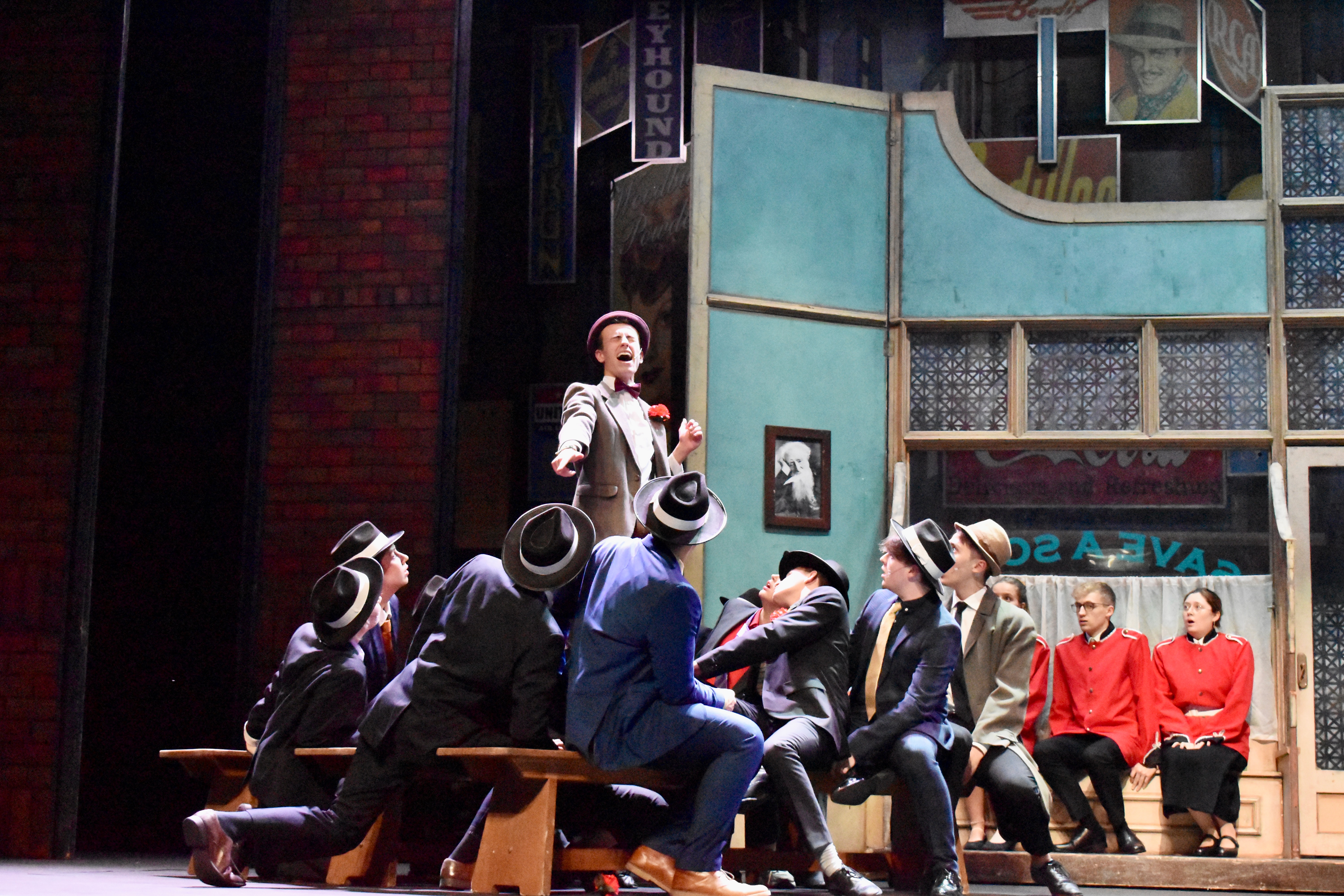 Sam Jones as Nicely performing  ‘Sit Down You’re Rocking the Boat’ surrounded by the other gamblers. Photo by Jennifer Leigh