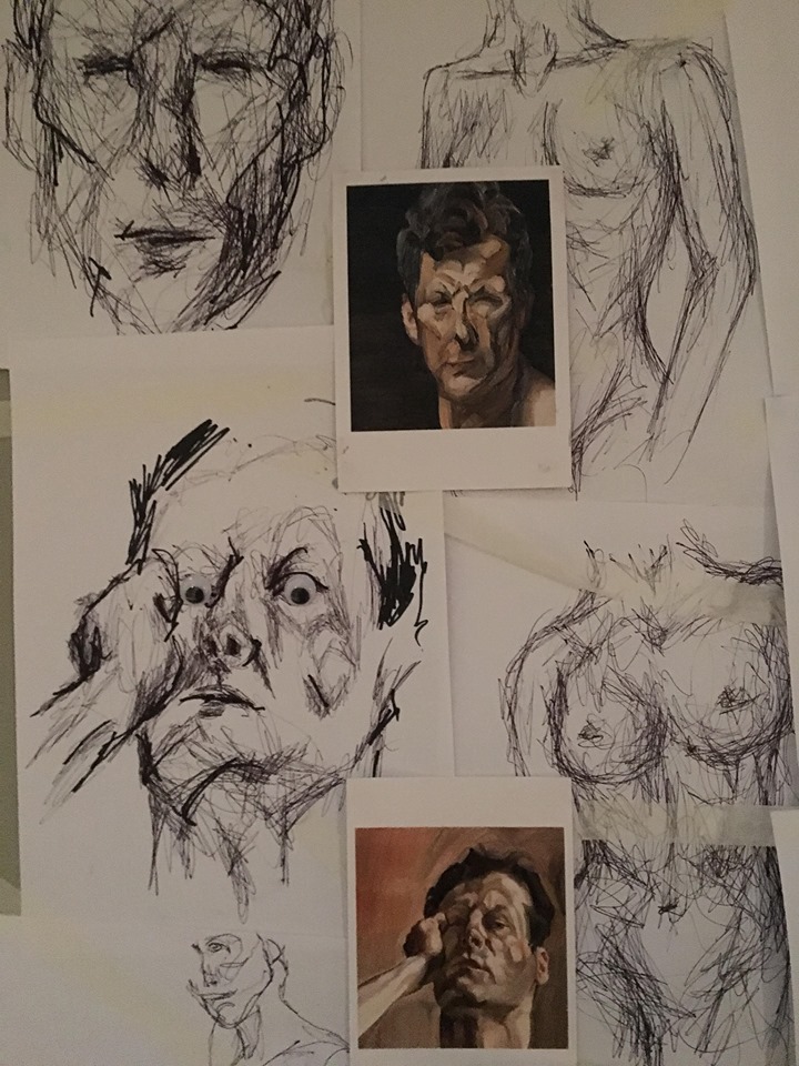 The staging is rather remarkable. The room takes the form of Hanker’s nightmare- plastered from ceiling to floor and across windows with manically scrawled drawings of human body parts, words in retraced black biro spelling out hate, confusion, terror- ‘Who’s talking?’, ‘You’ve done enough thinking’, and ‘I’m starving’- all on torn paper and pages ripped from books. It must have taken hours to set up. A dining table and several stools make up the simple set, with the audience’s seats lined around the sides and reaching to the back of the room. The lighting is very effective, alternating from a paradoxical golden glow around the dinner table, to a more clinical white light at times with Hanker and Romm, to darkness as Clover whispers his venom. Credit is very much due to the tech team here (Adam Carruthers and James Goodall).