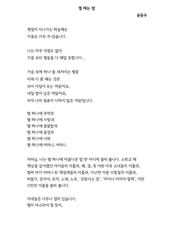 3) ‘A Night of Fathoming Stars ( 별 헤는 밤 )’ by Yun Dongju ( 윤동주 )