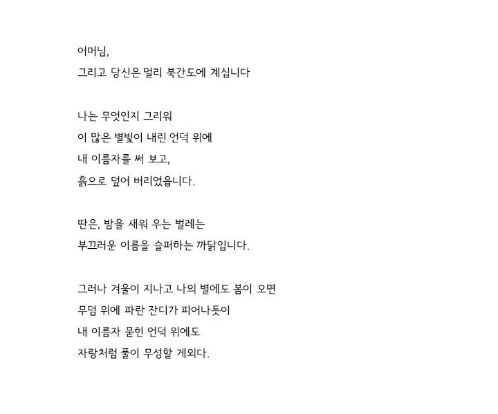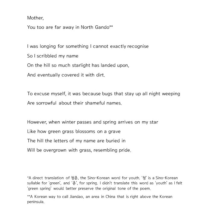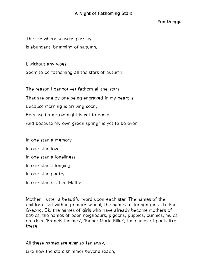 In the poem, the speaker ( who is also interpreted as Yun ) watches the stars in an autumn sky. Counting the stars, he bestows a certain meaning on each of the stars and reminisces about the schoolmates, neighbours, and poets he used to know. Lastly, he pictures his mother in the night sky. This poem is quite lengthy compared to the other two poems, but I chose to include the full text to let you get the full experience of the lyrical, confessional language of 23-year-old Yun.