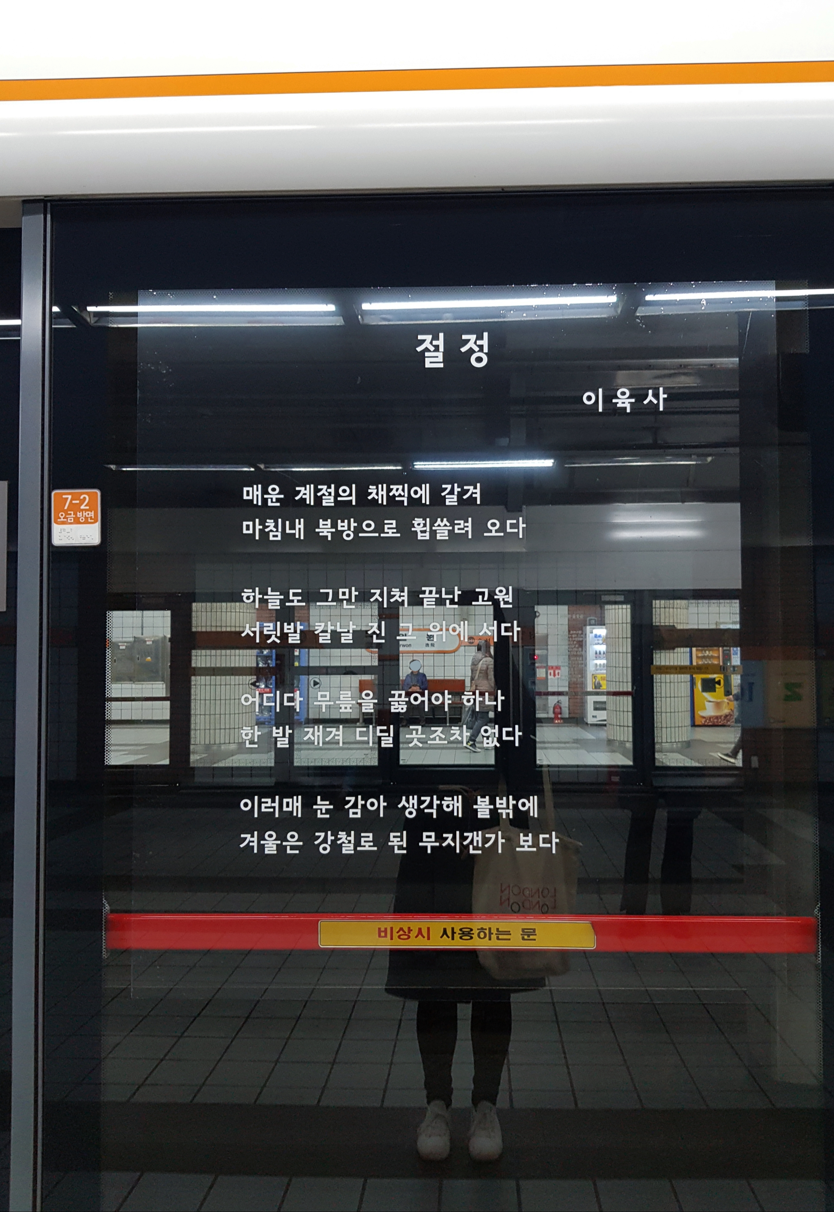 ( This poem was displayed at a subway station in Seoul. Seoul’s subway stations are known for featuring poems written by poets and even citizen contributors (!) on their screen doors. )