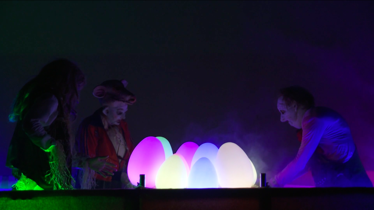 Screenshot of Farm Fatale performance “INTERN_2019_04_25_Farm_Fatale_CUT” on Vimeo by Münchner Kammerspiele : egg scene