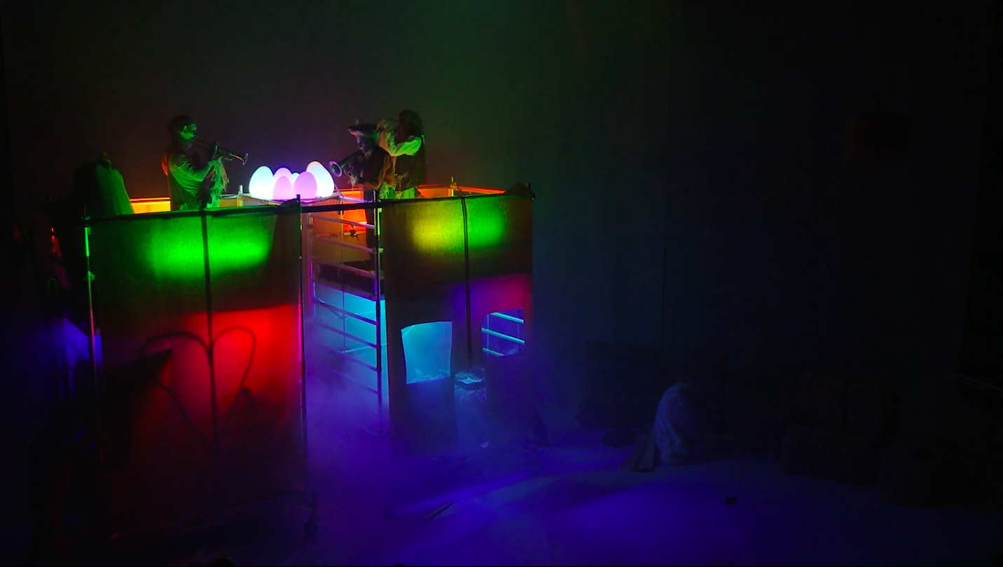 The esoteric, almost occult realm created by Philippe Quesne is almost solely achieved by lighting and colour : the fluorescent green, blue and red convey the idea of an in-between reality, after life but before life, after destruction but in the process of creation, a sort of purgatory where anything—any colour— is possible. Through lighting, Philippe Quesne offers a self-reflective play which, beyond raising awareness regarding the threats against the environment, tells the audience how drama as an art can reinvent itself. Despite the absence of a clear storyline, the lighting subtly indicates a timeframe. At first, the stage is bathed in a white light, but as the ‘plot’ progresses, light slowly disappears, and darkness takes over. This allows the vivid colours to arise and captivate the audience.