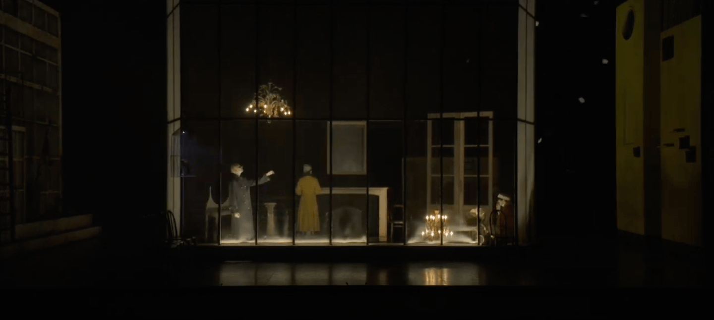 The discussion scene between the general and a subordinate in a room we observe through the glass walls— the only light comes from a ceiling light— gives the impression of a snow globe, a frozen scene, just like a memory, but also just like a dream.