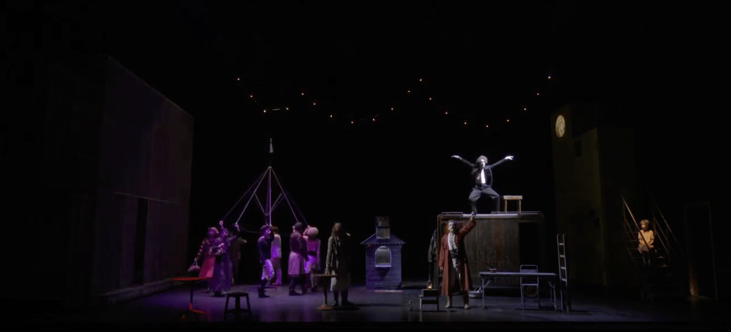 Although the play is fragmented and quite chaotic dramatically, a few elements insure a progression and they are, of course, visual elements. The lighting design especially allows a continuity throughout the succession of various images— the play being over four hours long, continuity is necessary. Indeed, a blue lighting illuminates the stage and takes a different meaning depending on the scene. The strong blue lines of the nightmarish trial scene convey the coldness of an implacable judge, while the blue mystical light of night during the balcony scene has a more romantic feel : it instantly becomes an oneiric musical interlude.