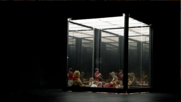 screenshot of “ATTAQUÉ PAR LES CHIENS – INFERNO DE CASTELLUCCI | RONAN AU THÉÂTRE” by RONAN AU THÉÂTRE on Youtube : children in the giant one-way glass box