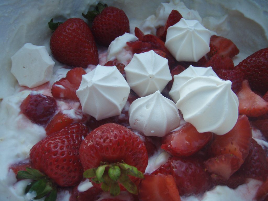 Whisk the cream until firm, before crushing your hopes and dreams meringues and mixing them in with the strawberries and whipped cream.