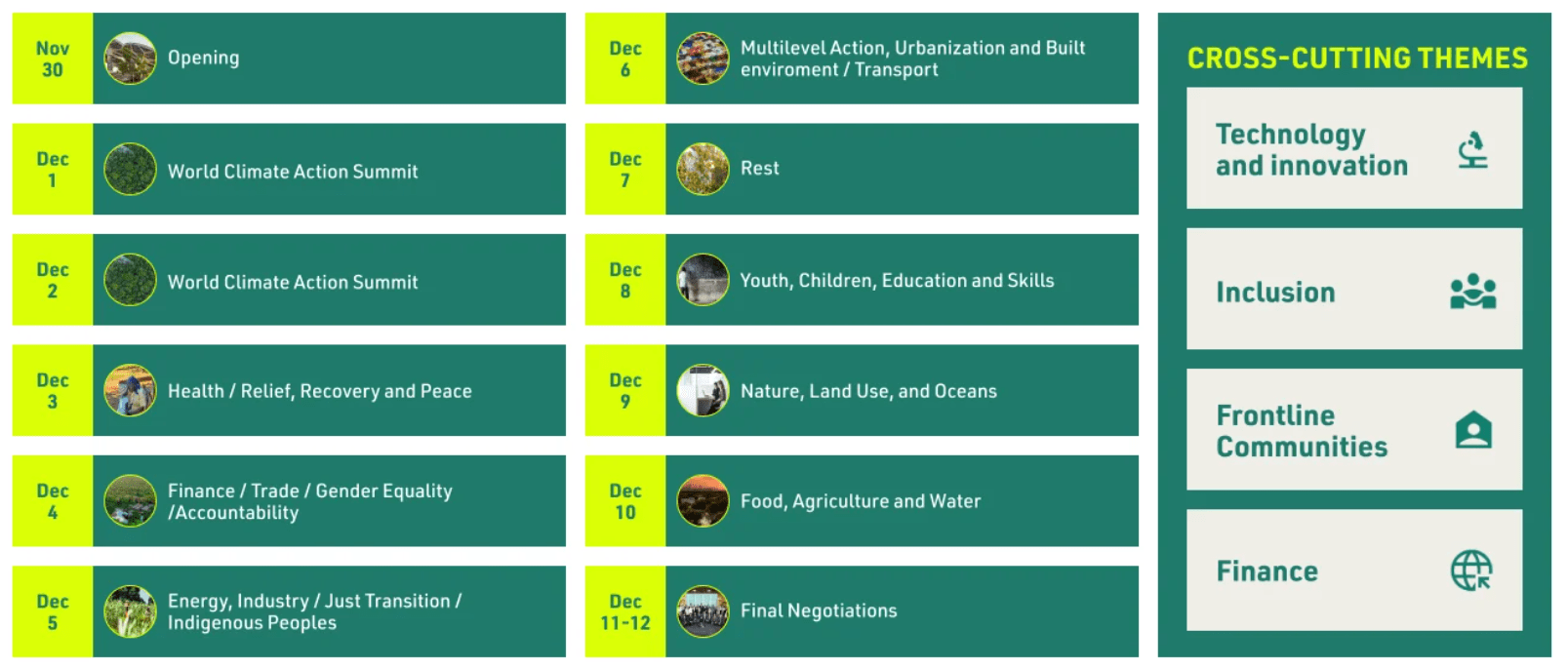 The thematic schedule of COP 28 centres around cross-cutting themes of technology and innovation, inclusion, frontline communities, and finance. Within this, there is a focus on health/relief, gender equality, accountability, indigenous peoples, transport, youth, education, agriculture, and many more. The presidency has set out a plan of action that focuses on four areas: