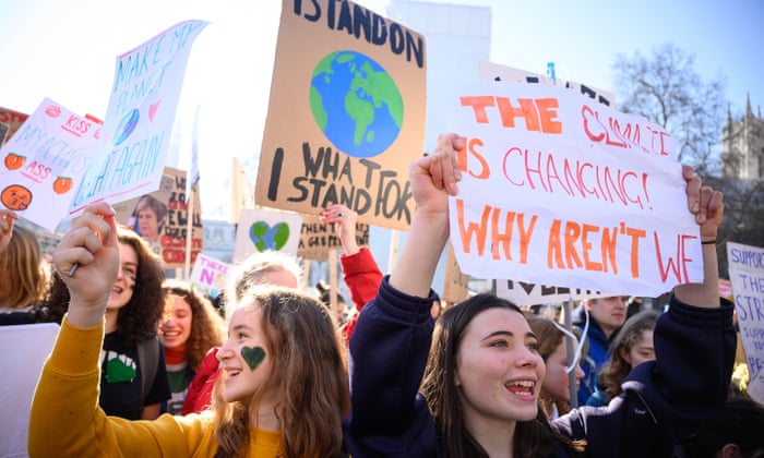 Students holds up their placards as they gather in Parliament Square during a climate protest on 15 February. Photograph: Leon Neal/Getty Images