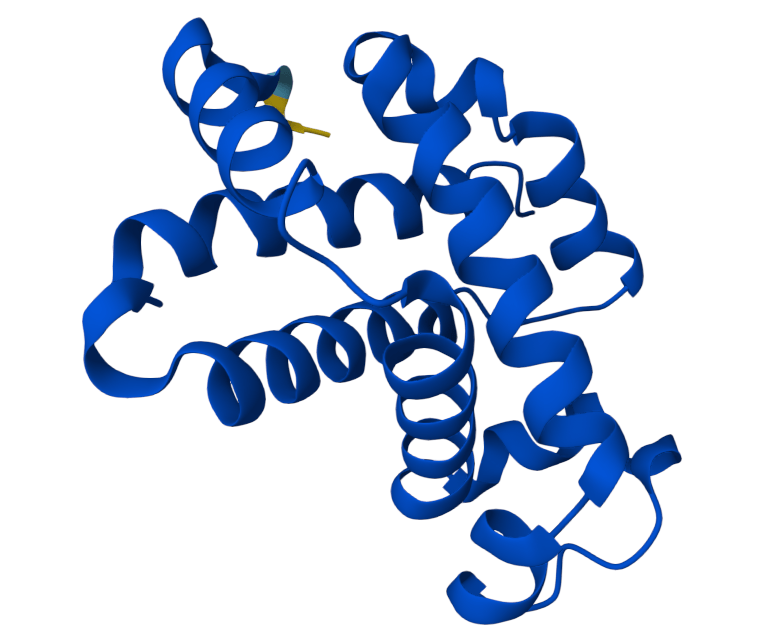 Haemoglobin subunit gamma protein (one of the proteins that makes up haemoglobin) as generated on the AlphaFold site. We were required to cite the following in order to use the image: