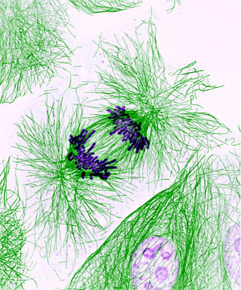 A dividing pig cell – in cancer, this normal process of cell division is broken. Image by Nasser Rusan, National Heart, Lung, and Blood Institute/NIH. Available on Flickr under Creative Commons 2.0 license. DNA-containing chromosomes are in purple and the microtubules which support the cell’s internal structure are green.