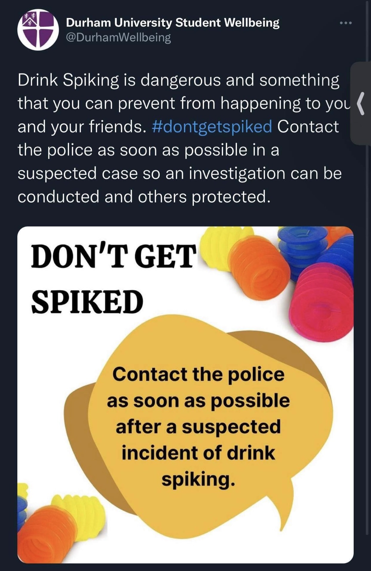 And yet, the message from Durham University’s Student Wellbeing team has been far from great. In a tweet issued last week, the team promoted the hashtag ‘#dontgetspiked’ and suggested that students “contact the police as soon as possible after a suspected incident of drink spiking” in order to allow for an investigation to be conducted. The tweet has been criticised by students and the media alike for placing the blame for spiking on those who have been spiked, rather than urging students simply not to spike drinks. The controversial tweet states that drink spiking is “something that you can prevent from happening to you and your friends” – a statement that seems very much in line with the victim-blaming discourse that is so popular when it comes to issues, such as this, that disproportionately affect women.