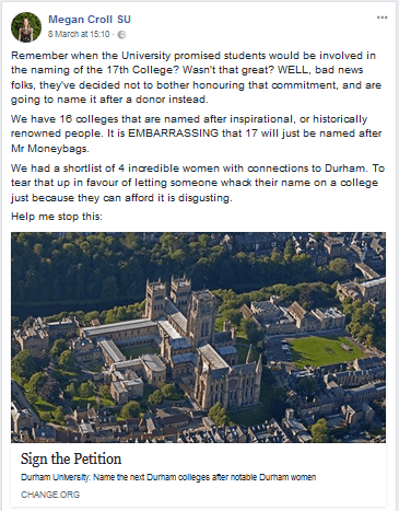 On 8th March, international women’s day collided with the announcement from SU President Megan Croll of the University’s abandonment of the promise to allow students to name our new 17th college, instead naming it after the wealthiest donor. Following a successful petition, the university responded saying the students’ position had been considered, but original plans to name the college would go ahead.