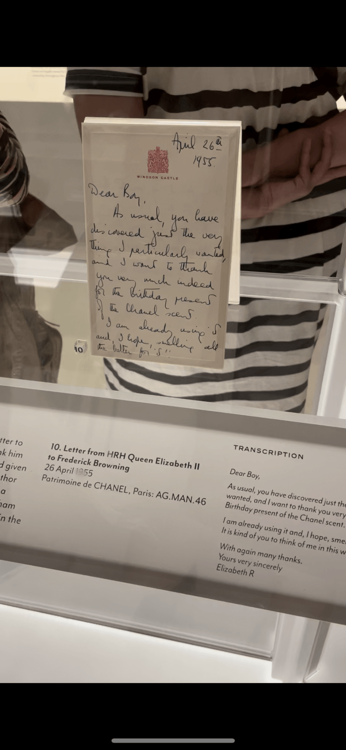 The exhibition portrayed more than just her fashion. There were rooms dedicated to her makeup, skincare, and perfume collection – all showcased in their original, cardboard, white packaging. A standout item was a letter written by HRH Queen Elizabeth II to Frederick Browning on 26th April, 2955, thanking him for sending her a bottle of the Chanel No.5 perfume, that she is already wearing every day (see photo to the left). The entire collection finished with a show-stopping floor-to-ceiling stairwell demonstrating the most exquisite ballgown dresses I have ever witnessed (see featured image).