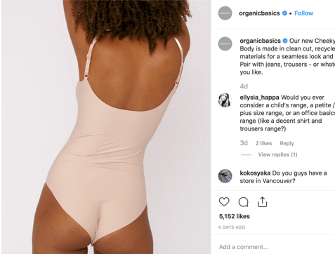 Organic basics, Cheeky Body in Nude, £40. Image available from https://www.instagram.com/p/B4o4BuHncyq/