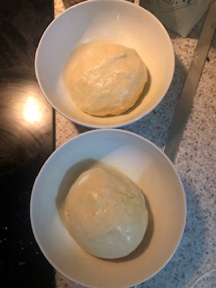 This amount of dough is enough to make four pizzas out of, so tear the dough into four equal parts and place each piece into separate bowls or containers that have been rubbed with a little olive oil to prevent them from sticking. If you wish to bake the pizzas straight away, it is best to leave them to rise at room temperature for a couple hours. If you wish to save some, simply put them in the refrigerator until you wish to bake them.