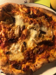 Now comes the fun part: stretching the dough and adding the toppings. Since these pizzas are very thin and flimsy when uncooked, you will want to have a piece of cardboard handy and flour it generously. Stretch your dough onto this piece of cardboard, making sure the pizza will be able to slide easily from the cardboard onto the baking tray already in the oven. Top your pizza however you wish to, I used a jar of ready-made tomato sauce from Tesco, some shredded mozzarella, some whole mozzarella that I cut up, some black olives and some pickled artichoke hearts. Make sure not to add to much sauce or cheese as too much will cause the dough to become soggy or not cook properly. Add less than you think you will need.