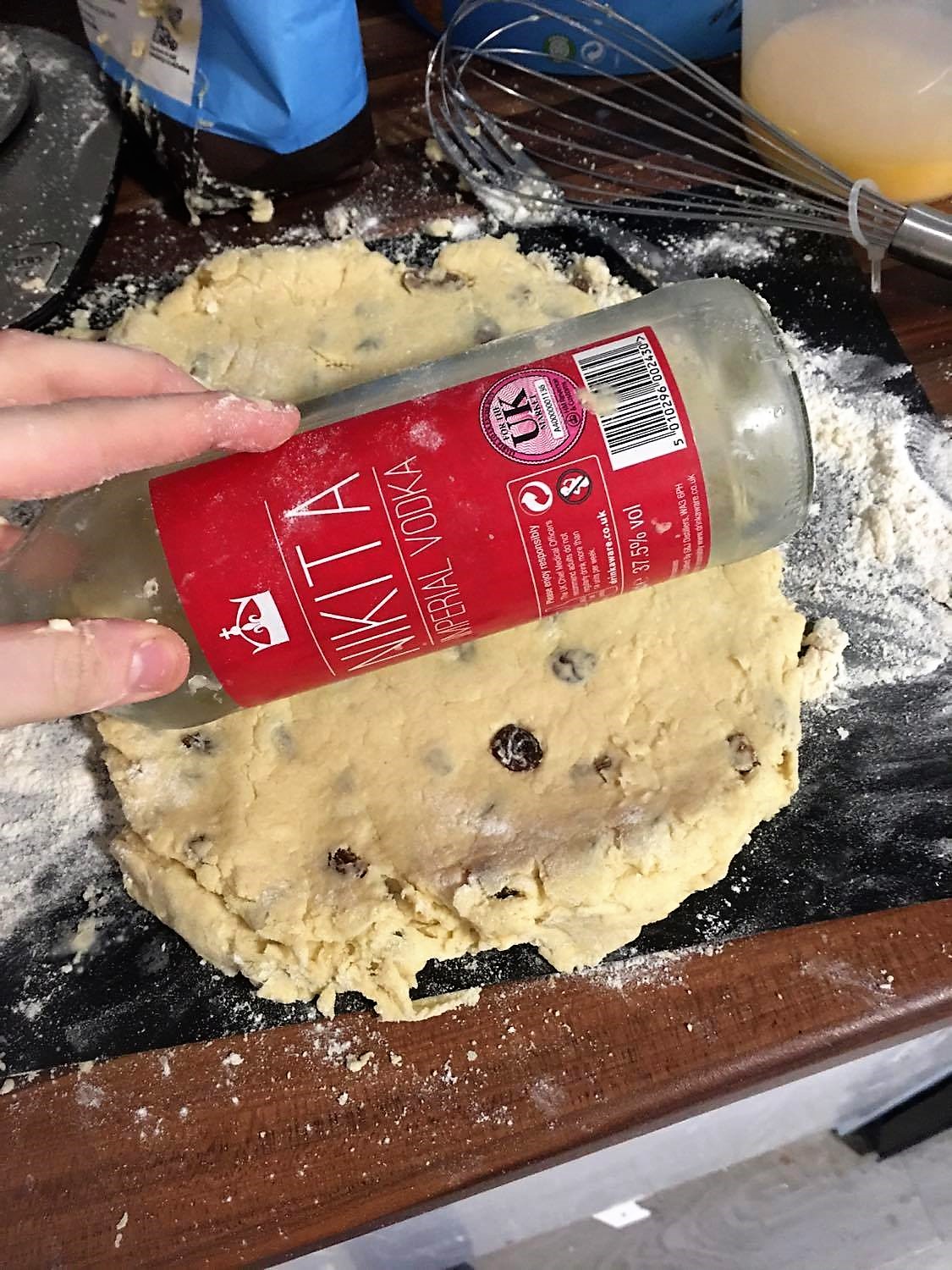 Beat 2 eggs with 150ml of milk and add this to the mixture which allows you to start undertaking the therapeutic job of molding it all together. Fold and turn the wet mixture on a floured surface until smooth compact and clod-like. Whilst generic recipes suggest rolling out of 1cm in thickness, I took on grandfather’s advice and rolled to roughly 2.5 cm. Yet in typical student fashion, using my flat-mates half empty long forgotten about bottle of Nikita in the absence of a rolling pin. Then sharply cut into rounds, not wasting the trimmings and re rolling until all the dough is used up. Then place on a greased tray, brushing the tops with the left-over egg and milk. Do not worry about separating each one out as scones are unlikely to spread. Then bake in a pre-heated 200 degrees oven for 12 minutes until the tops are a golden glow.