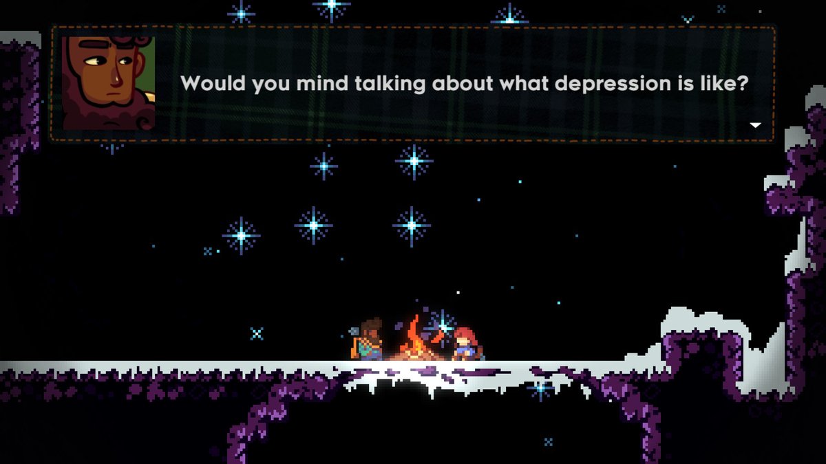 At one point, Theo (a fellow climber) asks Madeline, “Would you mind talking about what depression is like?” This comes at a quiet moment in the game where there is no platforming. No frustrating challenges to beat. Just an honest talk between two friends. These are the moments which make Celeste so special.