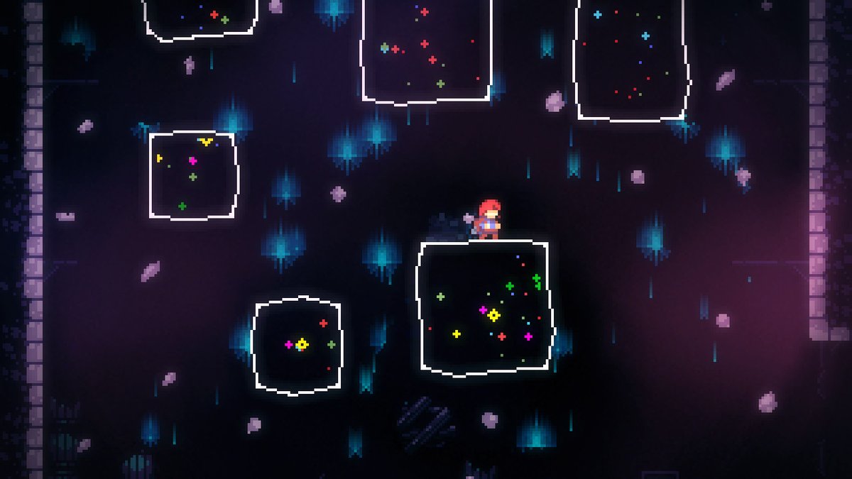 In an early level, there are large blocks of dark matter, that, if you dash through, pull you all the way to the other side. Once you see them, you can tell that they are something new and distinct. I knew straight away that I should try dashing through them.