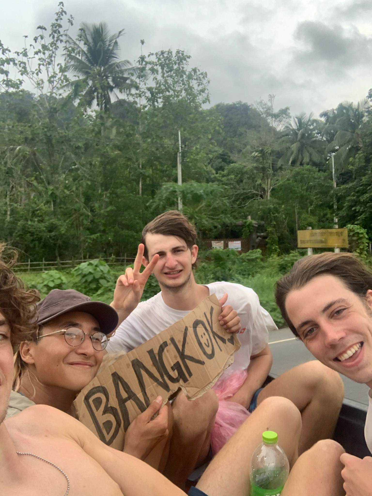 Hitchhiking isn’t too common in Thailand, and I can’t speak Thai, so when we left Khao Sok I was like a giddy child. I truly had no idea what was going to happen. Most of the time when you do something you have some idea of how it’s going to end up. You have a plan. We had no plan and no clue what was going to happen. To be completely clueless, to revel in the mystery and the unknown – a proper adventure. To let go of preparation and expectations is to be free. Twenty minutes after hitting the road, this pickup truck pulled over ahead. Sprinting after it, the driver put his head out the window. He was smiling. He was going in the right direction. That was all it took. He didn’t ask for money. He saw some people on the side of the road and that was enough. A pure willingness to help. The four of us piled into the back. Our bodies all intertwined in the bed, bags as pillows. So, our first hitch of this journey began. Everyone had a smile on their face. We laughed and sang and screamed. We weren’t separated by being inside a vehicle. Sitting there, wind blowing my hair around the place, the roar in my ears, the drizzle of rain, the landscape passing by. Rapture.