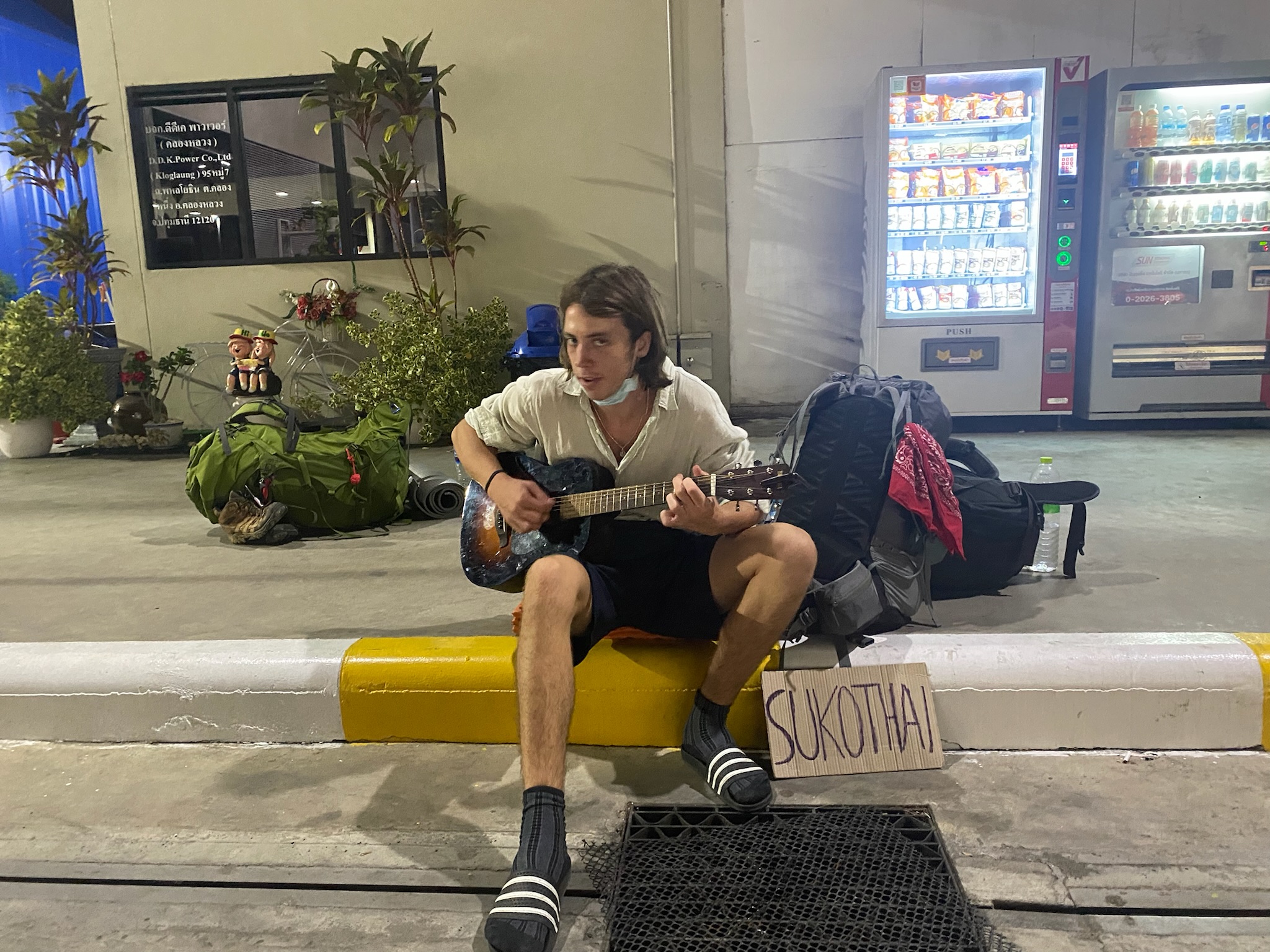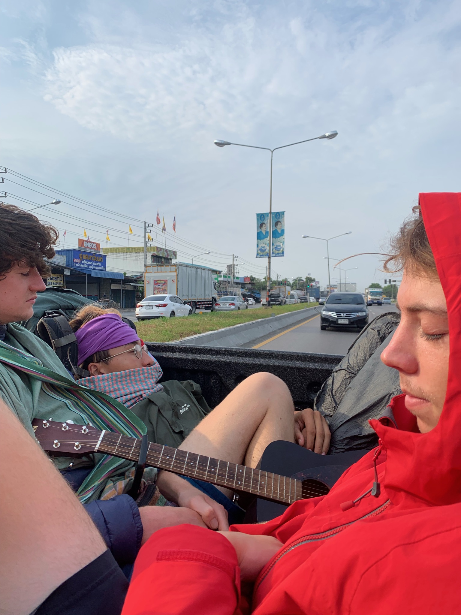 A week later my thumb was up again. Excited to no longer be stationary. To move. The road is enchanting, and nothing compares. Anything can happen on the road. A feeling of possibility. The possibility to live. Hitching out of Bangkok wasn’t easy. There were now three of us. We didn’t really think it through. We looked at the map and made our way to the main motorway out of the city. Turns out this motorway was a sky motorway. We stood underneath the motorway, laughing. This was meant to be our gateway out of the city. The gateway from city squalor to country serenity. In view but unattainable. We walked to a gas station nearby and our thumbs were up. No luck. We had set off at 3pm. We were lying outside the same gas station at 11pm. We had made it a few hundred metres. One guy approached us and asked us what we were up to. We explained that we were trying to head north. He spoke perfect English, so our hopes were high. He was just picking up gas before having dinner with his family at home. Nevertheless, he wished us luck and shook our hands. He drove away as we got comfy. An hour later he was back. Him and his brother at dinner had decided to come back and help us out. They drove us right to edge of the city and dropped us off by the main motorway. They returned to their families as we strolled to the nearest gas station. These were starting to feel like home. After a washing myself in the sink of the bathroom we set up base for the night. With a sign laid out in front of us, Hal, Xander and I lay there. It was now early morning. Still no luck. I didn’t really care. I was eating an ice cream, Xander on my left was playing his guitar, and Hal asleep on my right. The night rolled on. It was now 6am. It had been over 24 hours and we were still in Bangkok.